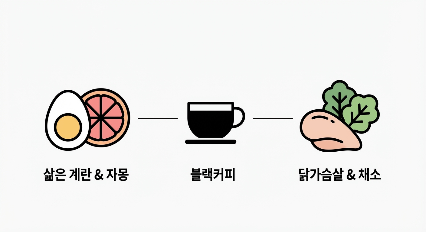 | 1일차 | 블랙커피, 삶은 계란 2개 | 삶은 계란 2개, 시금치, 토마토 | 스테이크, 샐러드 |